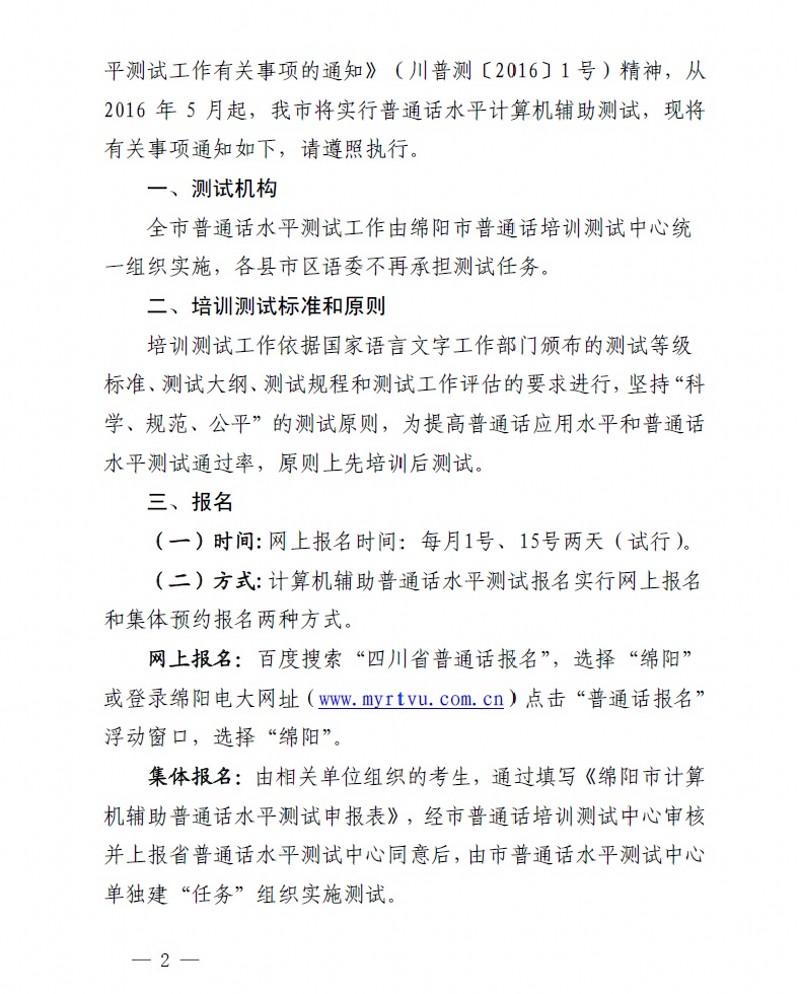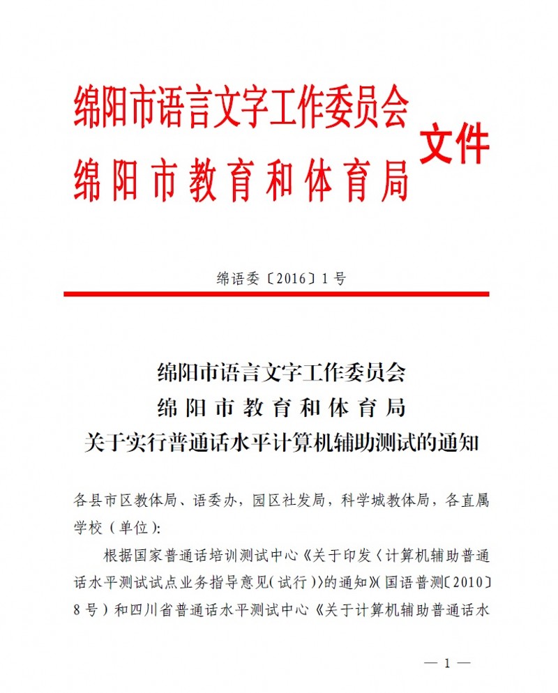 綿語委〔2016〕1号 關于實行普通家廠話水平計算機輔助測試的通知來源:四川綿陽師培網浏覽數:874次