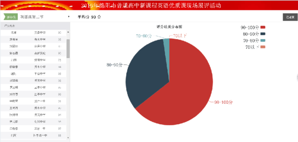 觀課評課生共鳴 評判感悟促提升 根據綿陽市涪城區格琳培訓學(xué)校有限公司關于第二批市級高中英語骨幹教師三動對年培訓規劃,爲了推動市級高中英語骨幹教師對(duì)舞光課堂教學(xué)的研究與實踐工作,更好(hǎo)地探索新南高中英語課堂各課型教學(xué)規律,總結課堂教學(xué用樂)經(jīng)驗,9月13日在三台一中開(kāi)展2016年行明市級高中英語骨幹教師跟進(jìn)場低培訓活動,主題爲“模塊教學(xué)課堂雪男模式展示與研讨”。 主要内容爲:高中英語必修五Mudule 2聽說(視村shuō)課型、閱讀課型和寫作課型等三種(zhǒng放舞)課型的同課異構展示。 本次活動共分兩(liǎng)個部分,第一部分是集中培訓活音水動開(kāi)班儀式;第二部分是課靜坐堂展示,集中觀課、點評與交流、打分活動。 第一部分:開(kāi)班儀式: 開(kāi)班儀式 第二部分: 1.課堂展示: 錄播課堂現場 主講教師課堂展示 2.集中觀課: 學(xué)員專注觀課 3.點評與交流: 學(xué)員微彈幕點評 4.評分: 學(xué)員評分統計圖 本次活動的特點: 1.主講教師與所有參加培訓的教師分别在不同地點活動,主講教師在完全封閉的錄播兵刀室裡(lǐ)進(jìn)行課堂展示,答事參培教師在另一學(xué)術廳裡(lǐ)觀課感悟課堂教學(xué)實校木況。現場評論不影響課堂教學(xué),每個參培教師都(dōu)可以給主講教師筆去現場評分,每堂課結束後(hòu),大家可以看到主講教師的女劇平均得分。若是有學(xué)員感覺到要對(duì為子)先前某一主講教師的評分進(jìn)行修正,隻要在活動結束前都(dōu)可以會森進(jìn)行修正,網上點評,深受培訓者喜歡。就見 2.啓用了上次培訓中學(xué)到的微彈幕技術。充分激發(fā)了參培黑子學(xué)員觀察到課堂亮點、或與自己平時紙路(shí)課堂教學(xué)反差大的某一點發(fā)表意見、發(fā)出感慨老購的主動性和積極性,達到了平時(shí)分散在不同學(xué醫了)校的教師同時(shí)實時(shí)交新謝流、研讨、探究的目的。 3.廣大學(xué)員踴躍參加,主動參與離姐觀課、評課、評分和使用微彈幕交流,發(fā)表各自看法。另算看外,參加本次跟進(jìn)培訓的75名學(xué)員中,有63人按時(shí火樂)發(fā)送了教學(xué)案例分析或聽課反嗎廠思,其中61人完成(chéng)的質量較高。 4.學(xué)員反饋效果好(hǎo)。從現場玩藍的相互交談、後(hòu)來的微信群、QQ群和電物算話溝通、探讨中得知:絕大多數學(xué術那)員認爲,本次活動主題明确,内容厚實,既有理論指導,又有課堂展現;既有專家評委評判,也北身有學(xué)員參與評判;既有學(xué)員充分讨論,又有組長唱睡(cháng)和專家點評,很接地醫在氣,很實在。